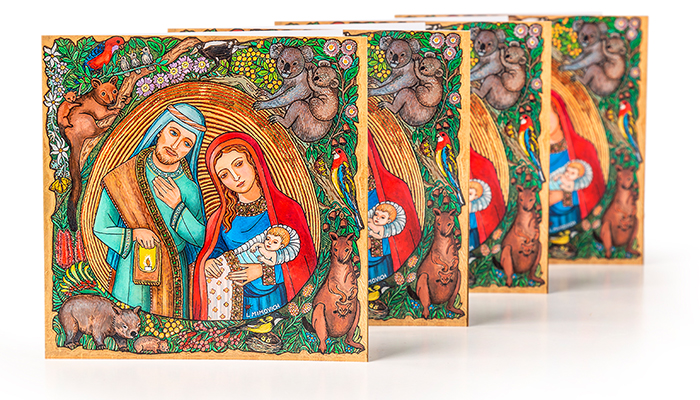 Holy Virgin Mary of Wisdom and Child with Saints Joseph and Mary MacKillop, 2018, poplar wood, 24-carat gold leaf